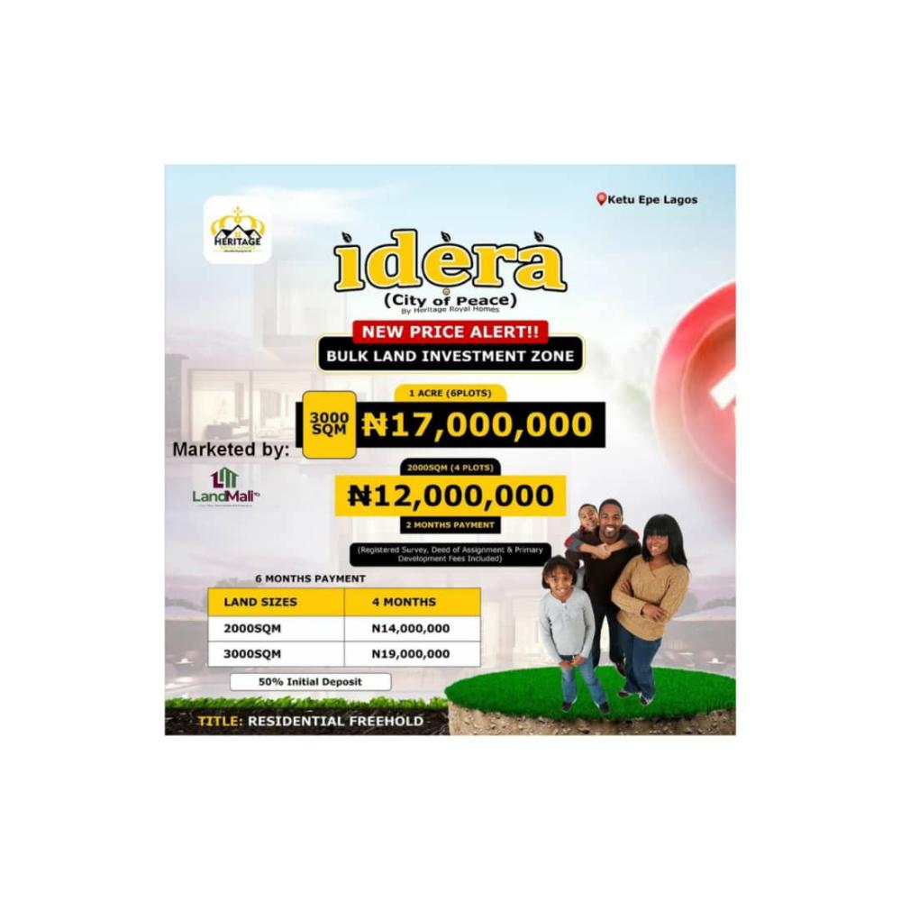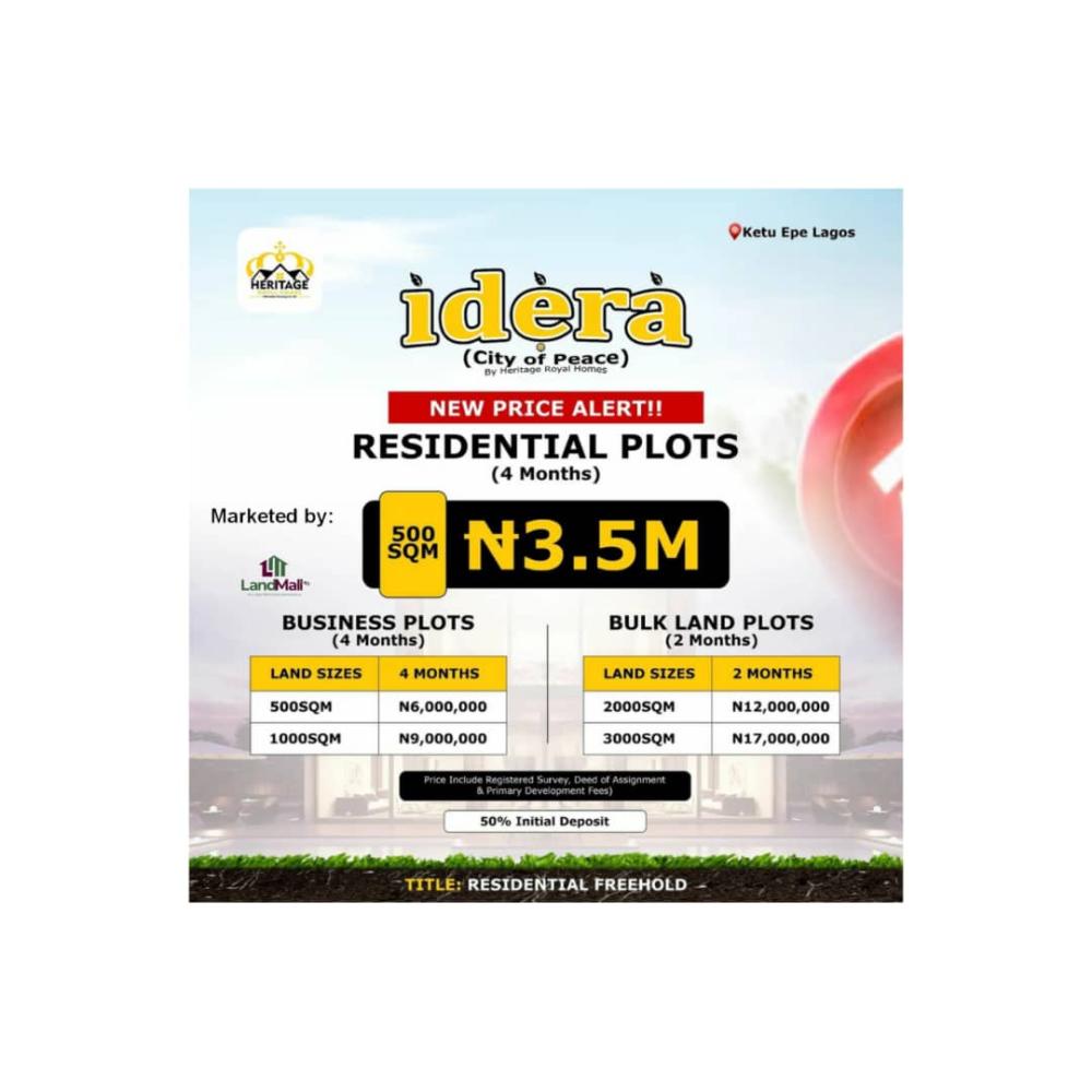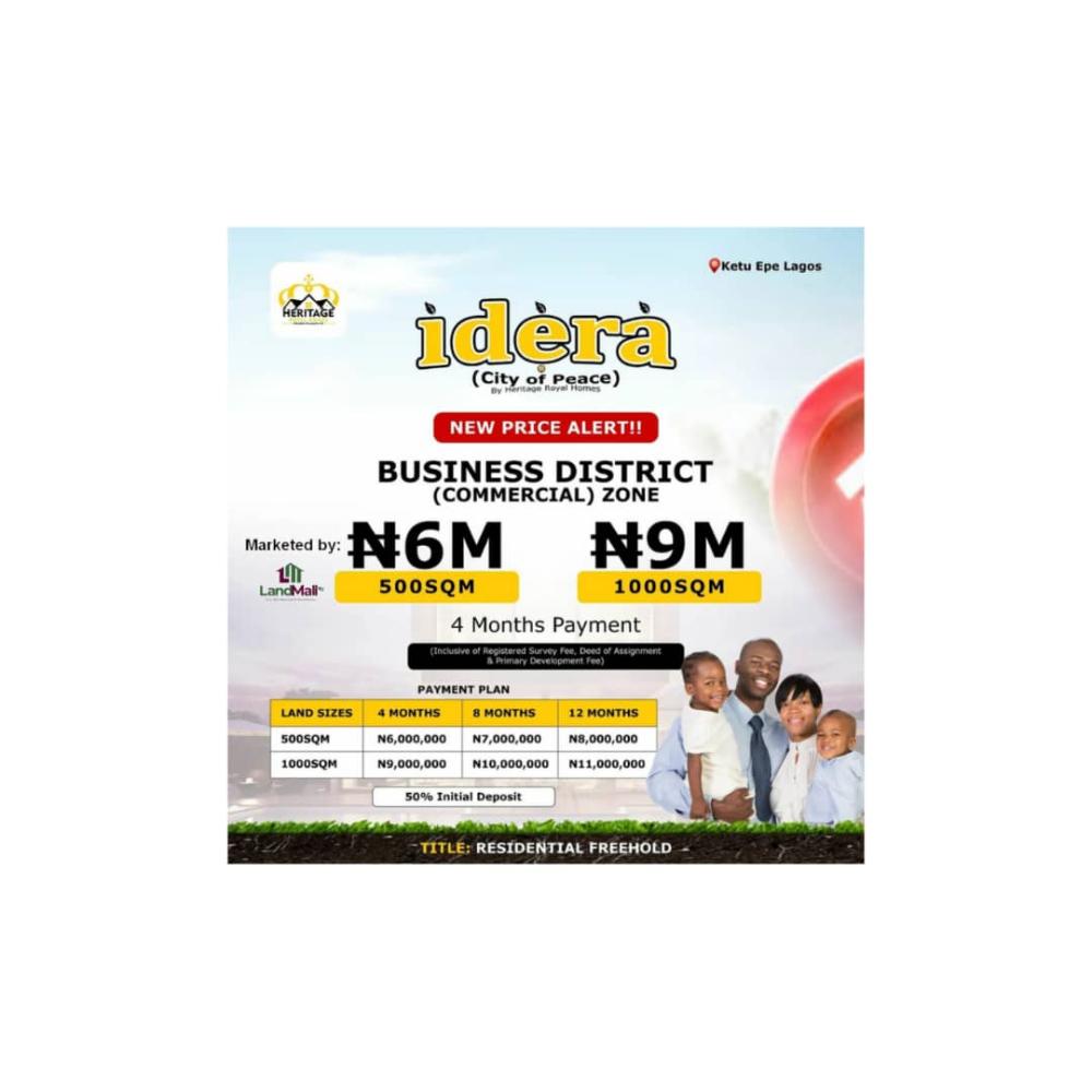 Welcome to Idera-City of Peace, Ketu-Epe. This property spans across different investment forms, whether its Residential, Commercial or Investment purpose, you can get all from Idera-City of peace.